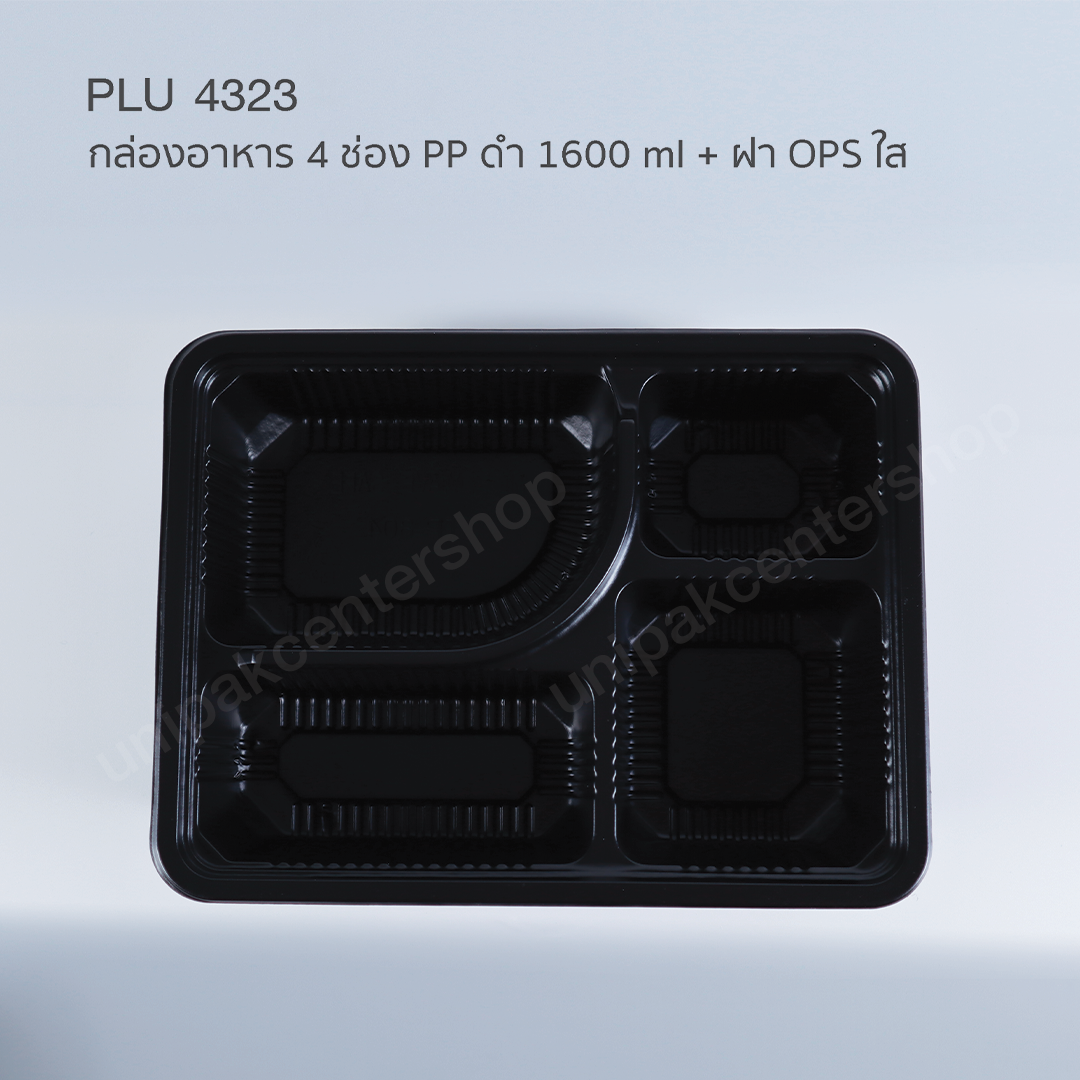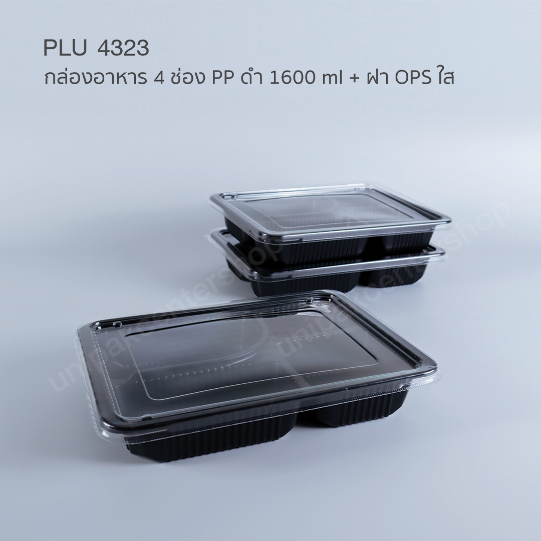 กล่องอาหารเหลี่ยม 4 ช่อง PP ดำ (TP-804) 1600 ml + ฝา OPS ใส